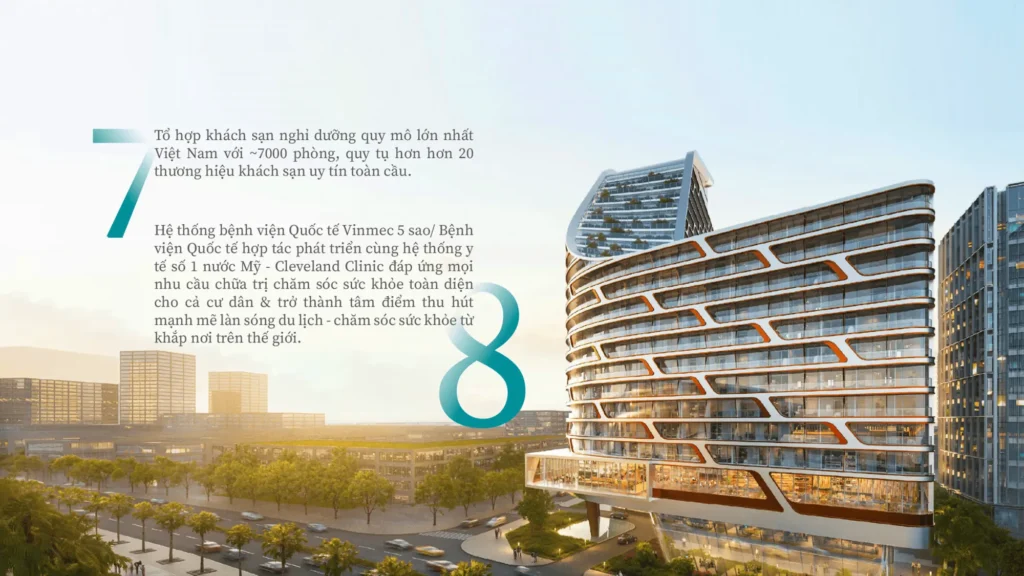 Tổ hợp khách sạn nghỉ dưỡng quy mô 7.000 phòng quy tụ hơn 20 thương hiệu uy tín toàn cầu (Four Seasons, Ritz-Carlton, Aman) kết hợp với hệ thống y tế Cleveland Clinic số 1 nước Mỹ tạo nên trải nghiệm sống đẳng cấp hoàn hảo. Đây là tổ hợp dịch vụ lớn nhất Việt Nam, áp dụng 100% tiêu chuẩn quốc tế từ nghỉ dưỡng ultra-luxury đến chăm sóc sức khỏe “Bệnh viện tốt nhất thế giới”.