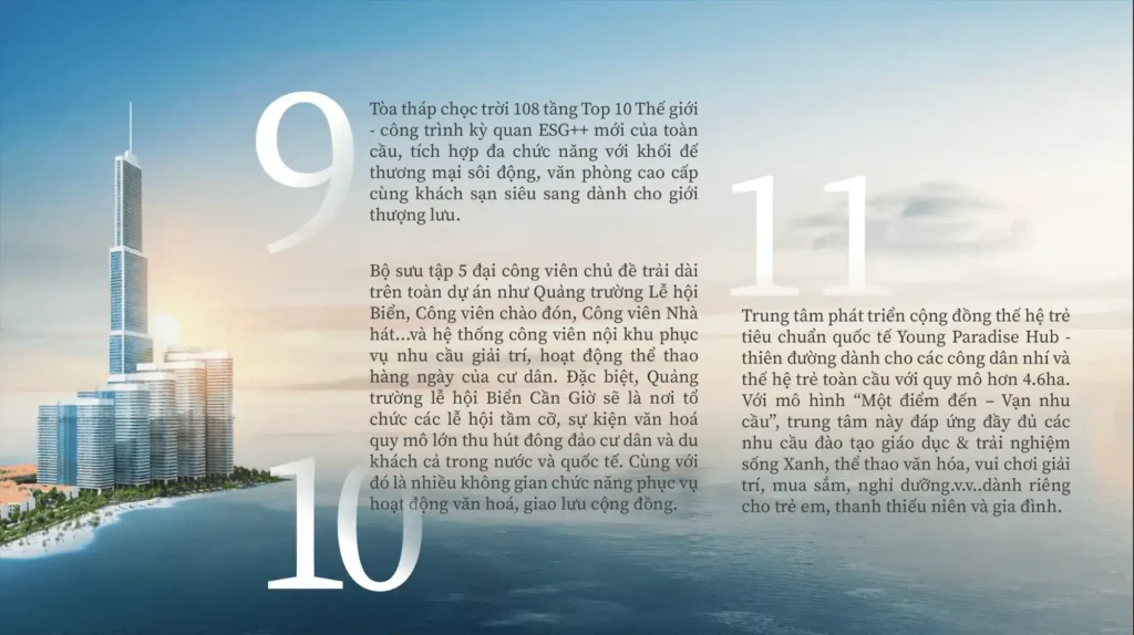 Tòa tháp chọc trời 108 tầng top 10 thế giới kết hợp với bộ sưu tập 5 đại công viên chủ đề (Quảng trường Lễ hội Biển, Công viên chào đón, Công viên Nhà hát) và Young Paradise Hub 4.6ha tạo nên hệ sinh thái cộng đồng hoàn hảo. Đây là “ngọn hải đăng thế kỷ mới” định vị Việt Nam trên bản đồ kiến trúc thế giới, nơi 70% diện tích dành cho mảng xanh và phát triển thế hệ trẻ toàn cầu.