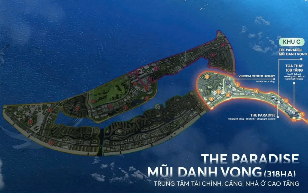 Phân khu C – The Paradise với 318 ha chính là nơi những giấc mơ thành đạt được hiện thực hóa, khi tòa tháp 108 tầng vươn mình như “ngọn hải đăng thế kỷ mới” – biểu tượng quyền lực nhìn thấy từ mọi góc độ của thành phố. Tại Landmark Harbour, những chiếc siêu du thuyền triệu đô từ Monaco và Dubai cập bến mỗi ngày, mở ra cơ hội giao lưu với giới thượng lưu quốc tế và kinh doanh dịch vụ du lịch hàng hải đẳng cấp với lợi nhuận 25-30% mỗi năm – cao gấp đôi so với đầu tư bất động sản thông thường.