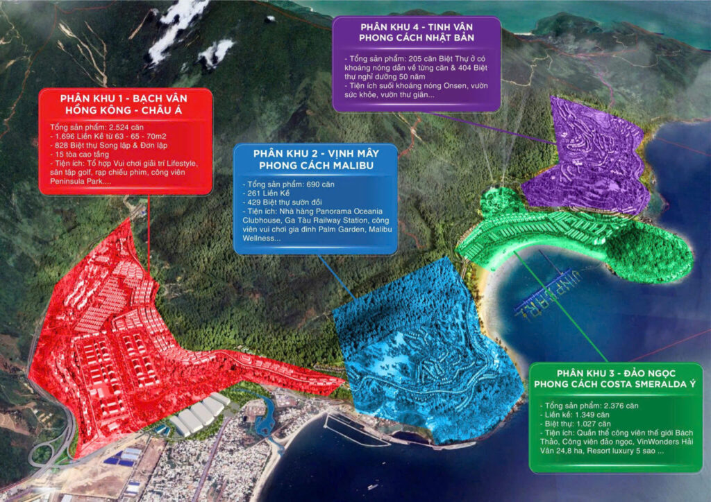 • Phân khu Vịnh Mây: Phong cách Malibu, Khoảng 690 căn biệt thự cùng hệ thống Panorama, Railway và dịch vụ đẳng cấp.